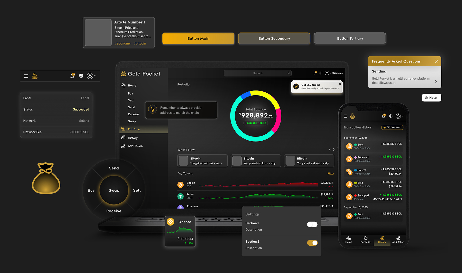 Gold Pocket is a consumer fintech platform that lets people convert between traditional currencies (e.g., USD, EUR, CAD) and digital assets (e.g., BTC, ETH, USDC), hold assets in secure wallets, and move money in and out of the ecosystem. The audience includes crypto-curious newcomers and everyday users—so the experience had to feel as familiar as their bank app, while meeting strict compliance and security standards.